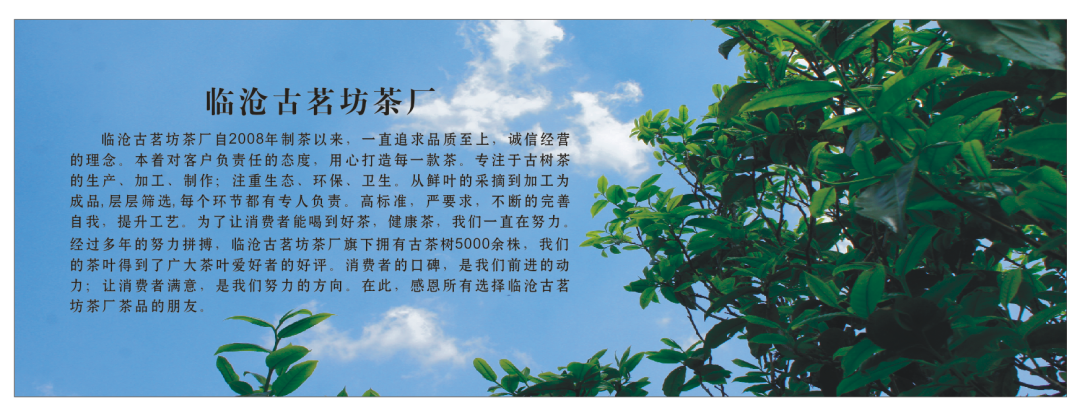 为了让消费者能喝到好茶,健康茶,我们一直在努力,经过多年的努力拼搏,临沧古茗坊茶厂旗下拥有古茶5000余株,我们的茶叶得到了广大茶叶爱好者的好评。消费者的口碑,是我们前进的动力;让消费者满意,是我们努力的方向。在此,感恩所有选择临沧古茗坊茶厂茶品的朋友。