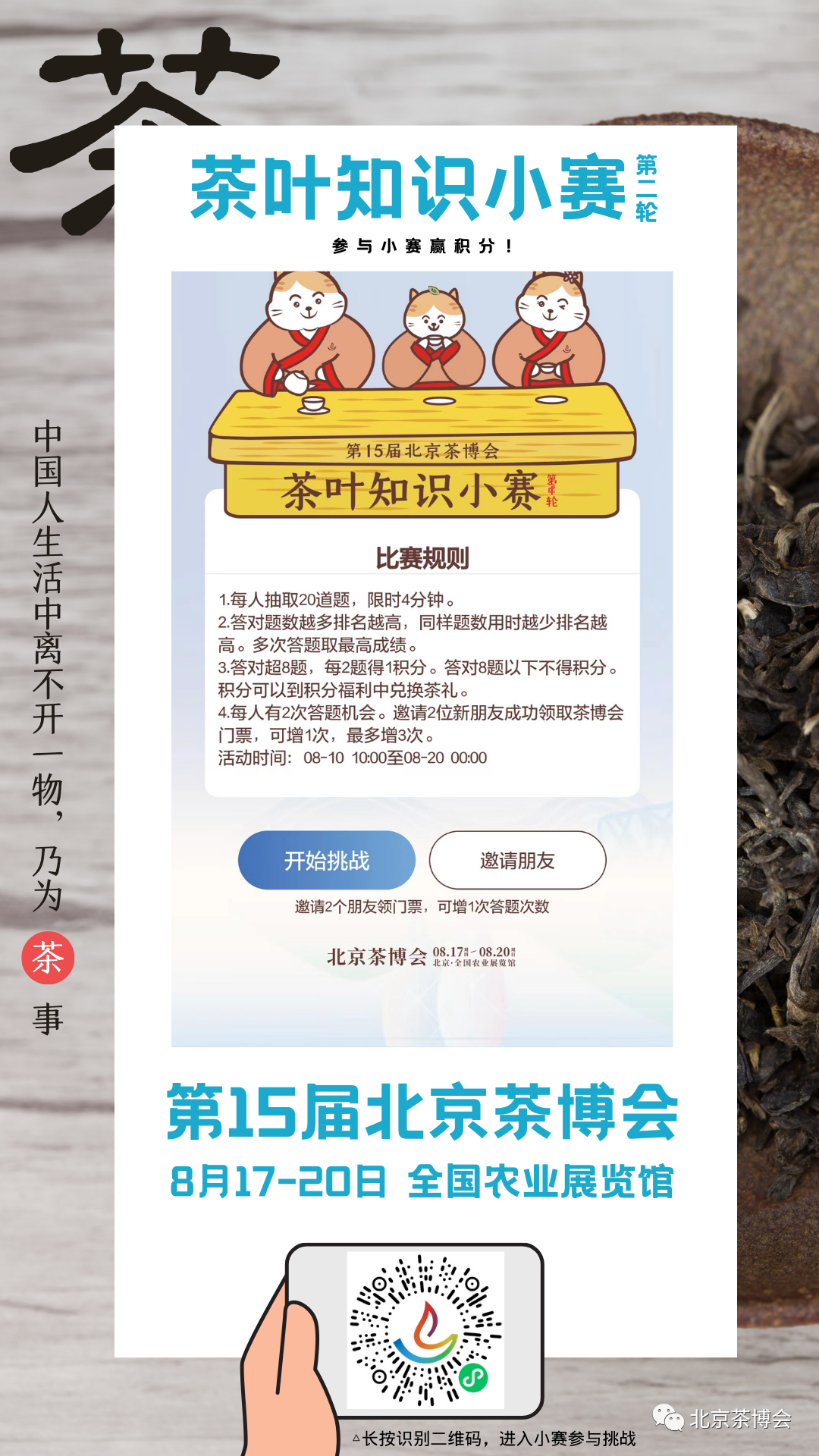 第15届北京茶博会第2轮茶叶知识小赛今天正式开启!第二轮小赛将持续至8月19日,请各位茶友及时参与,答对8题后,每2题的1积分,每轮20道题,邀请好友还可以增加答题次数。